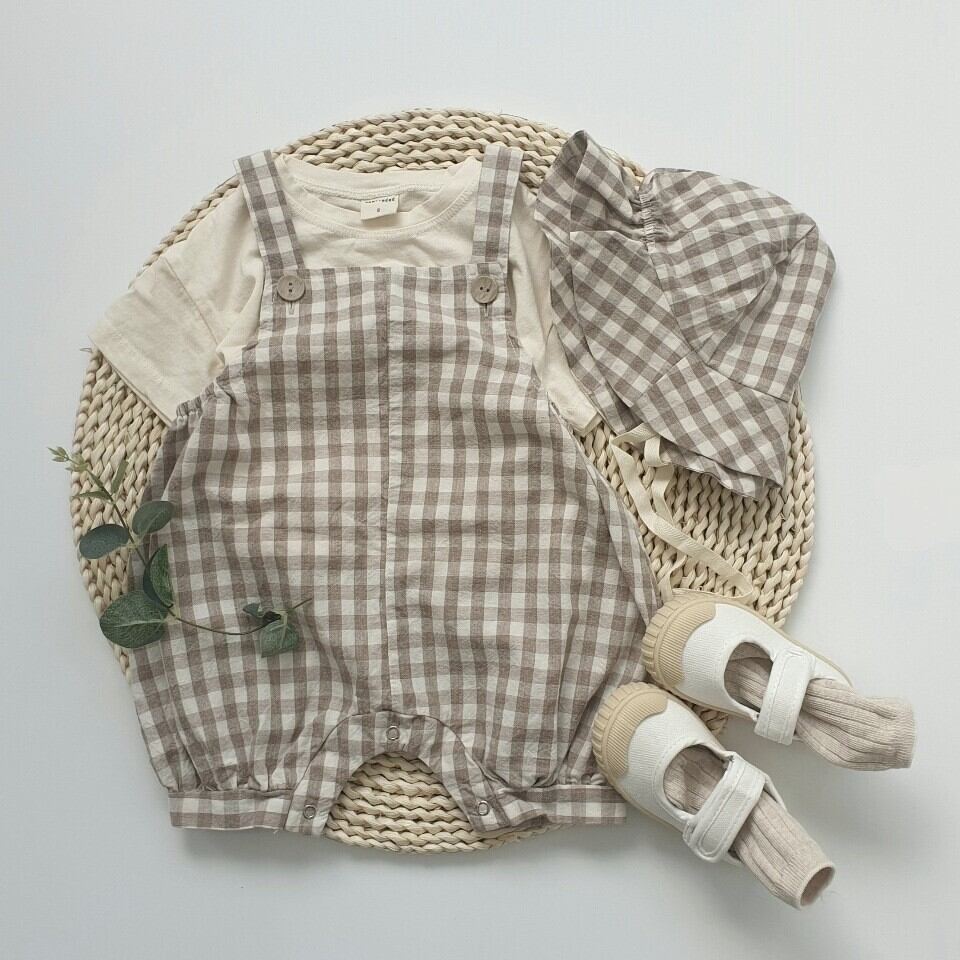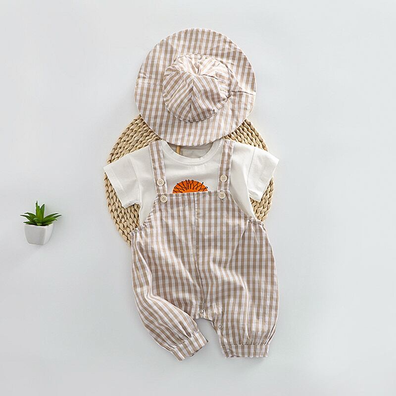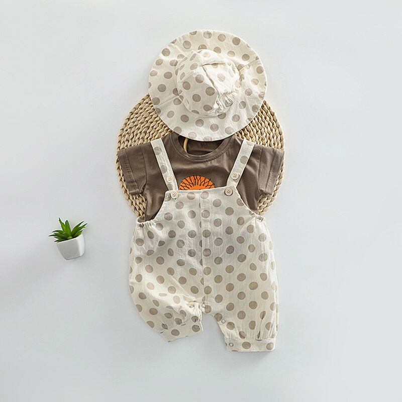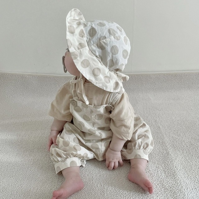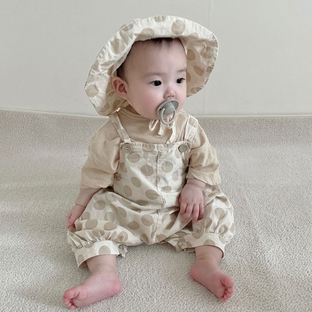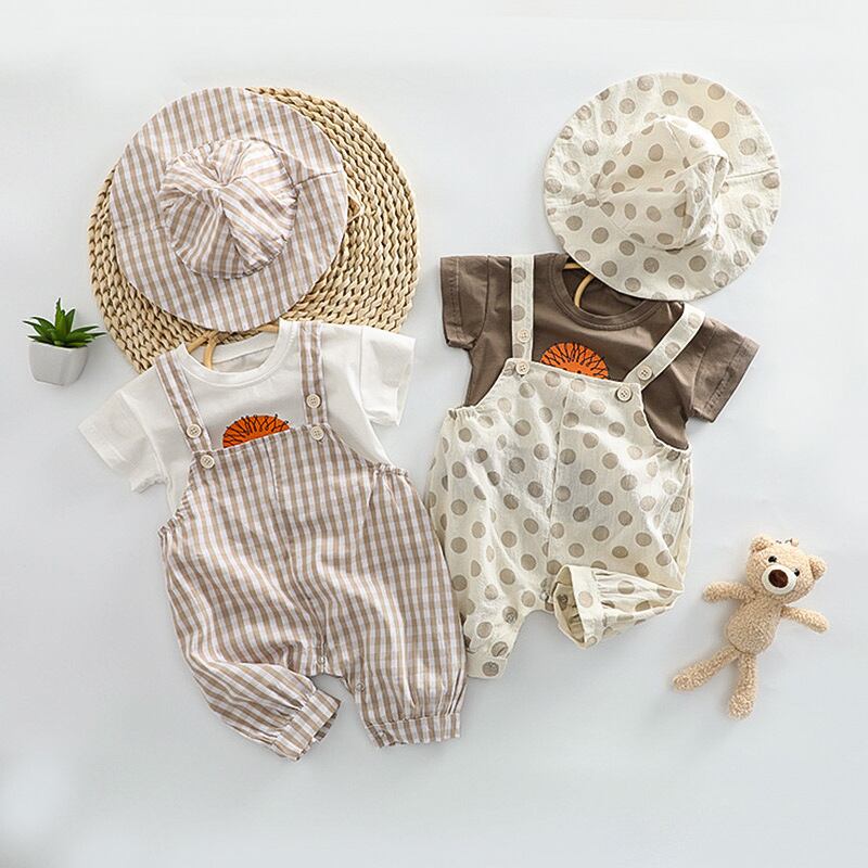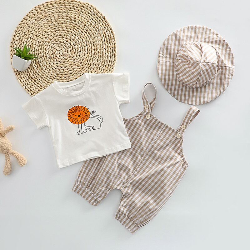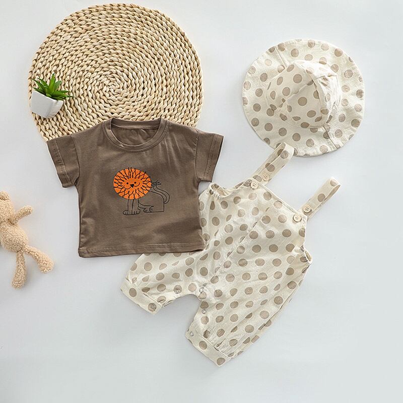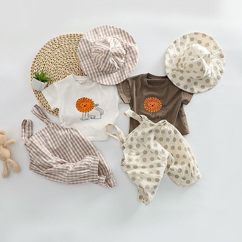 【夏作】帽子付きドットORチェックサロペット&ライオンプレゼントシャツ3点セット 全2色