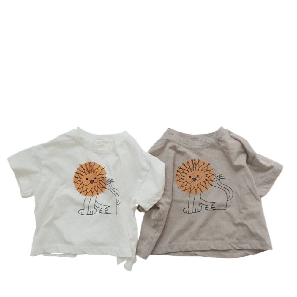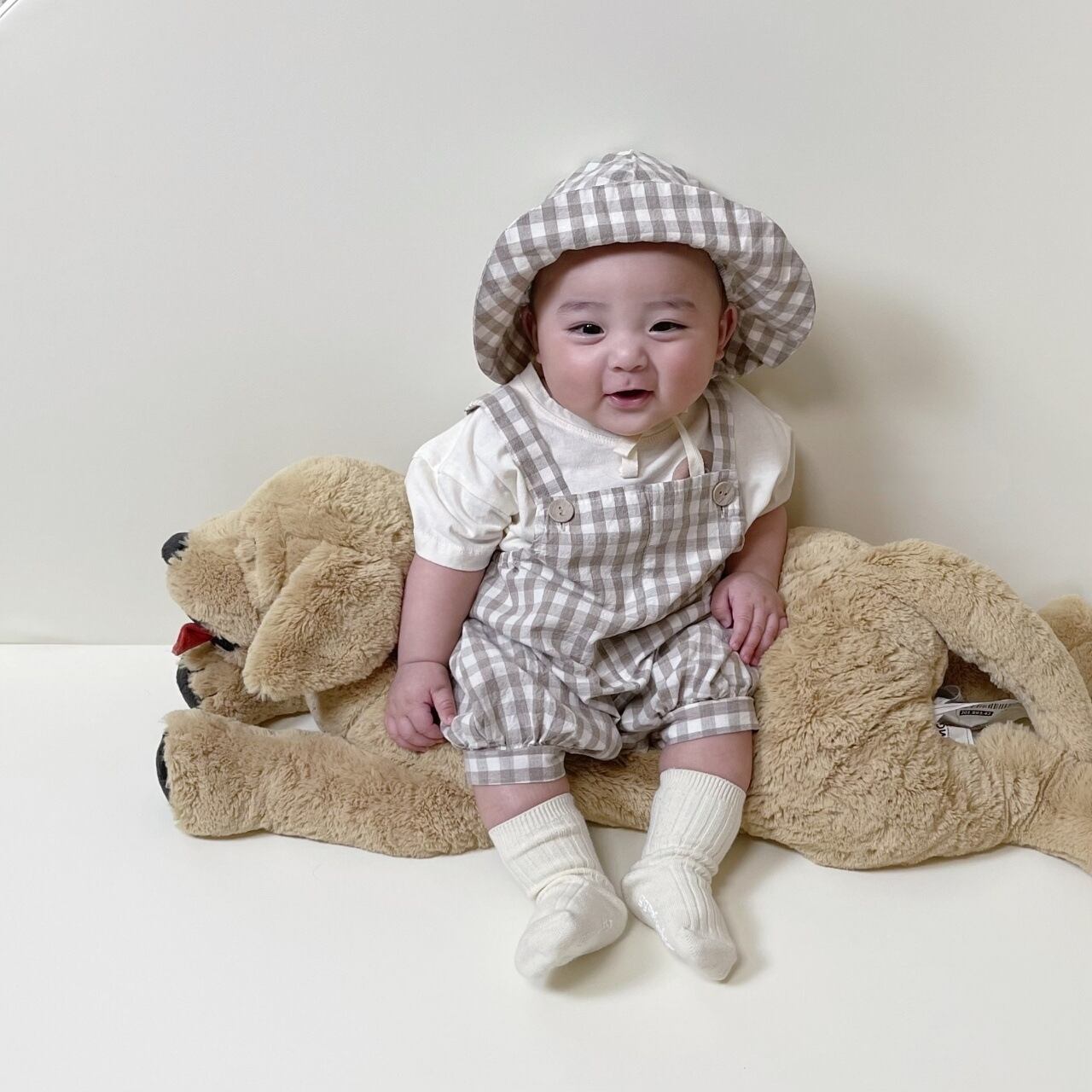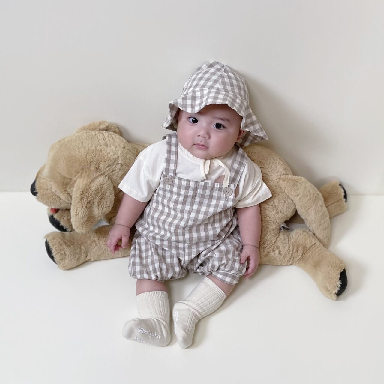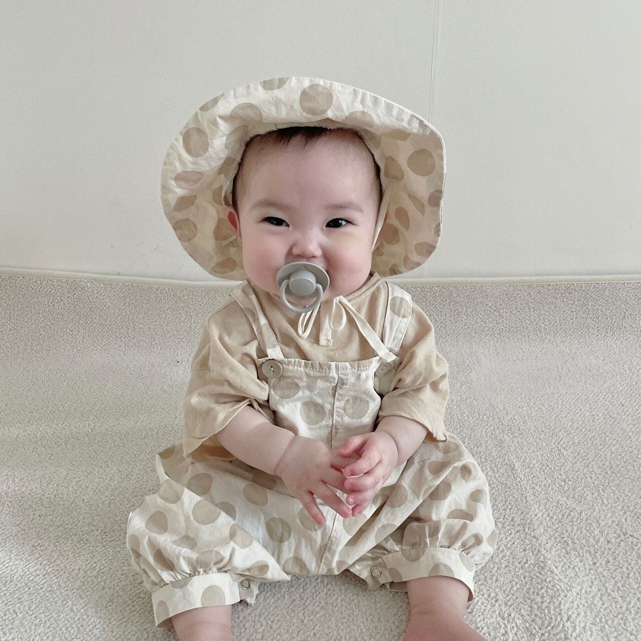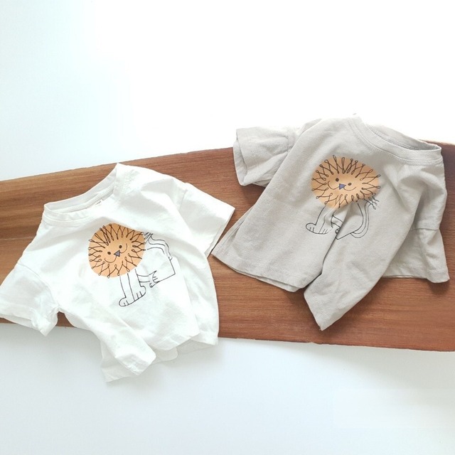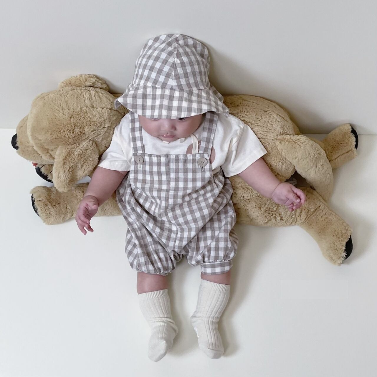 【夏作】帽子付きドットORチェックサロペット&ライオンプレゼントシャツ3点セット 全2色