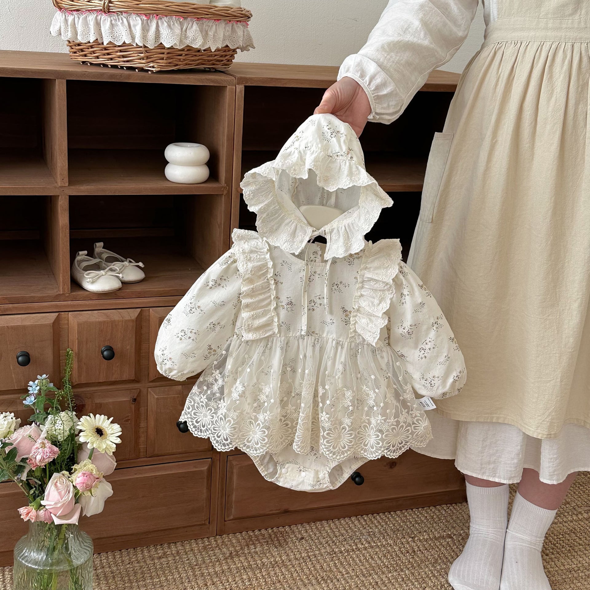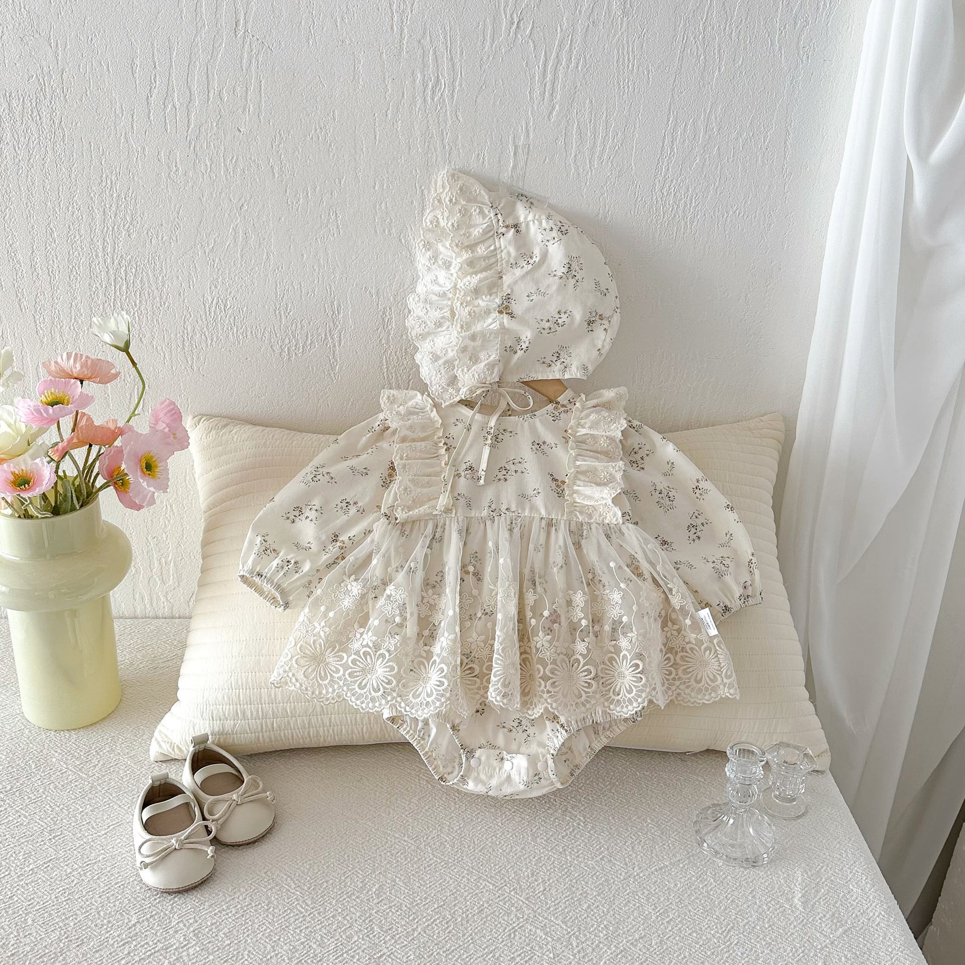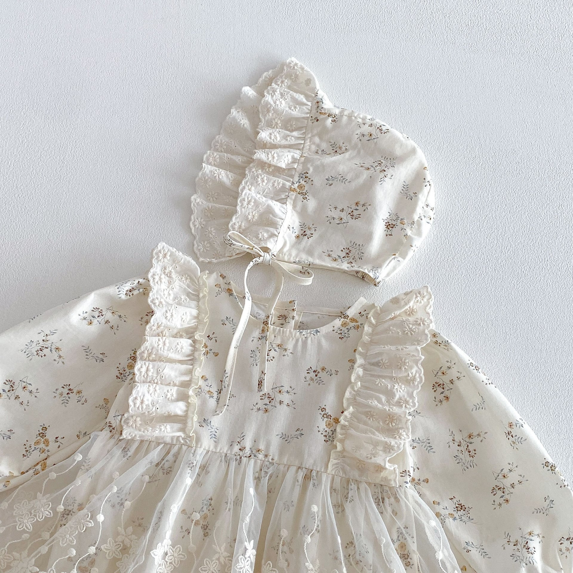 【春作】ボンネット付き小花柄ロンパース
