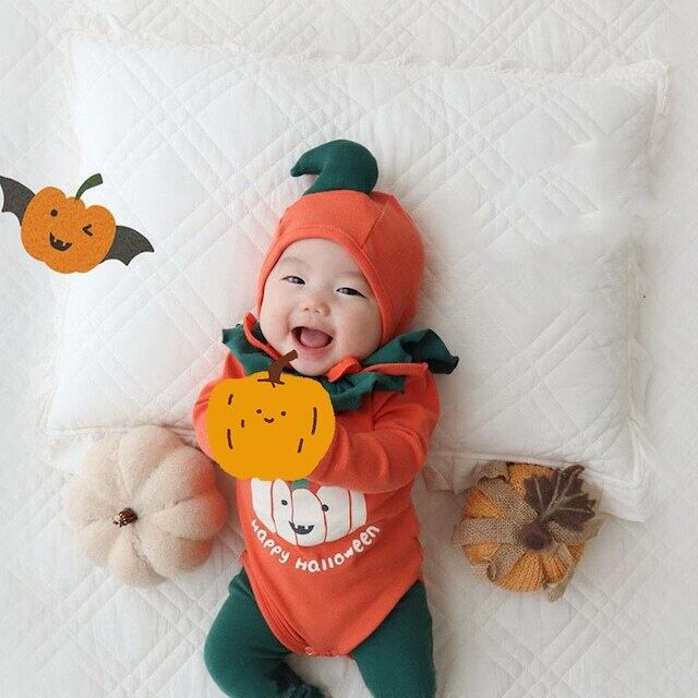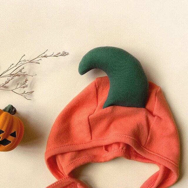 【秋作】ハロウィーン 帽子付きかぼちゃロゴロンパース