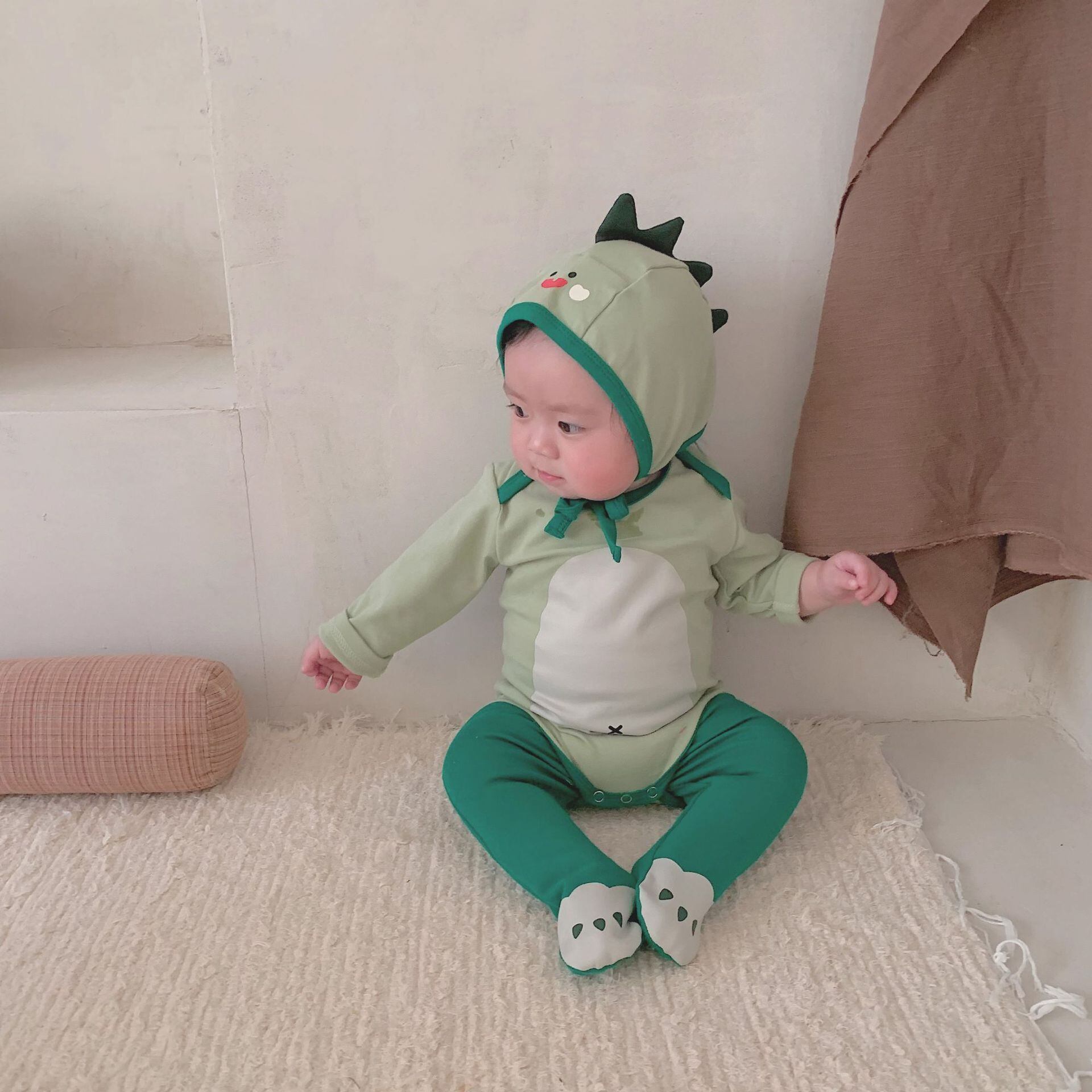 【秋作】フード付き 恐竜ロンパース+レギンス3点セット
