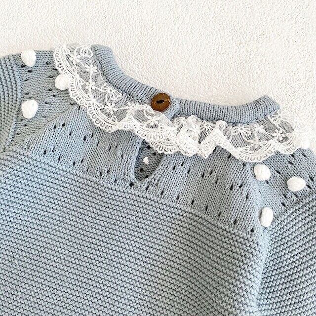 【秋作】帽子付きレースフリルポンポン付きニットロンパース