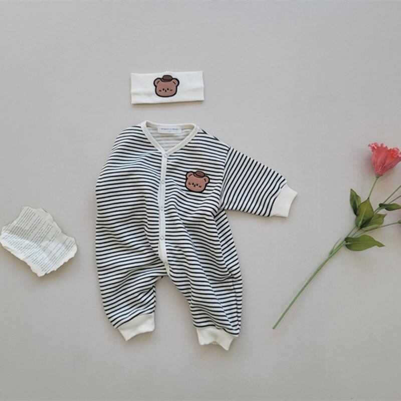 【秋作】バンド付きボーダー熊柄オールインワン 全2色