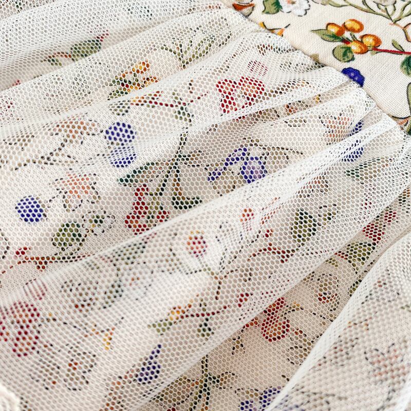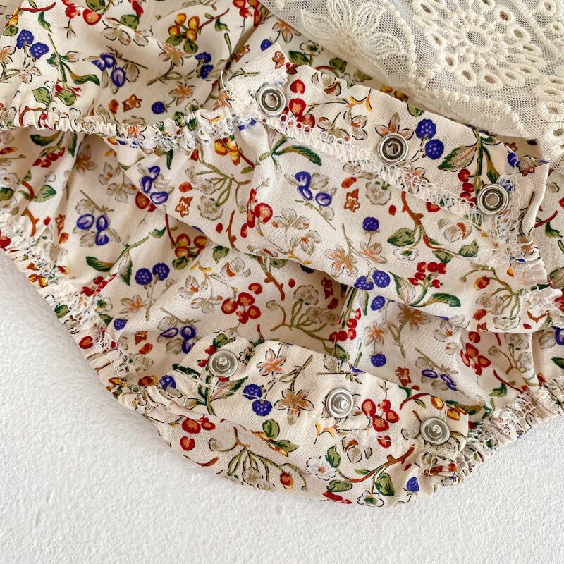 【秋作】ボンネット付きレースワンピース風小花柄ロンパース